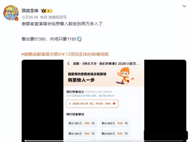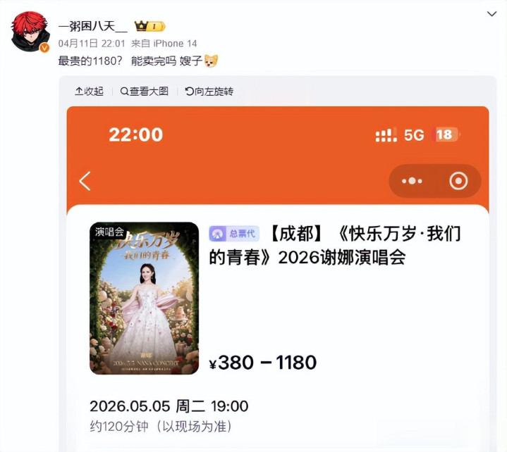 一场演唱会的最高票价卖到1180,是不是订价定低了? 毕竟,当今的明星演唱会动辄上千元的票价一经很无数,致使连相声岳云鹏的内场票价也高达千元以上。而谢娜最近也要开演唱会,其票价最高定到了1180元,有网友直言:只消1180,是不是意味着票价定低了?