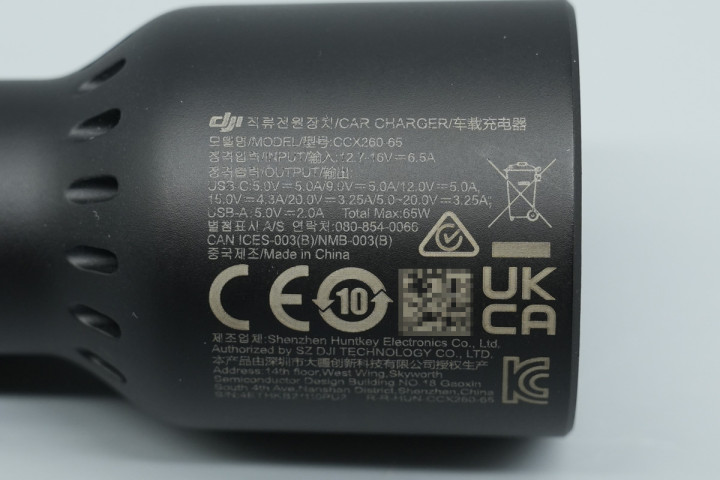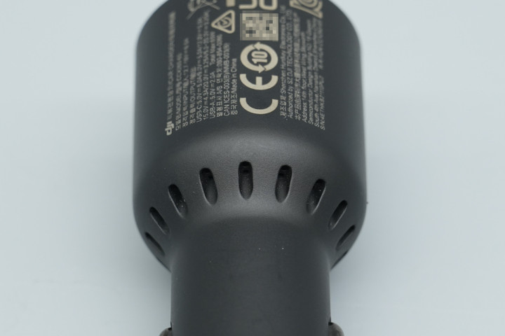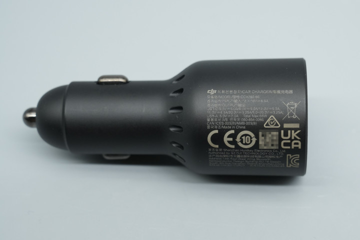 大疆65W快充车充采用PC阻燃材质塑料外壳,机身流线型过渡,壳体名义哑光工艺处理。