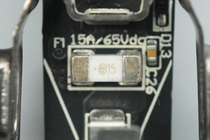 去掉塑料支架,下方设有保障丝,来自贝特电子,额定电流15A。