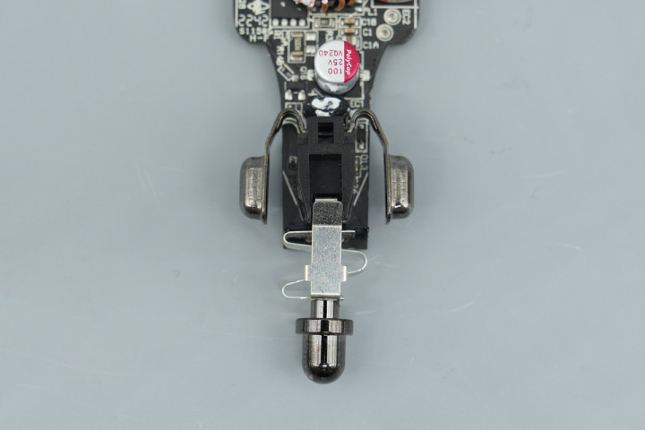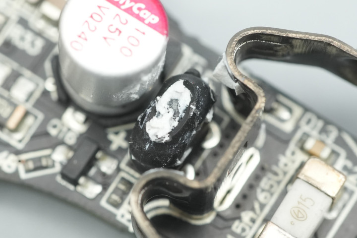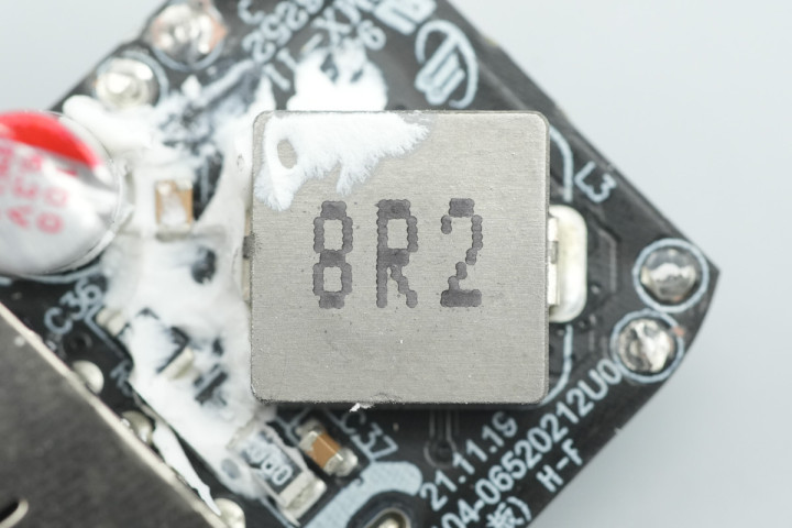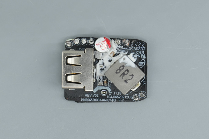 USB-A接口母座场合小板正面设有降压电感和滤波固态电容。