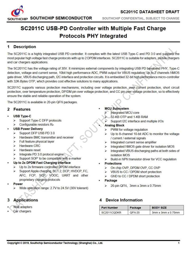 USB PD 快充公约芯片来自南芯科技,型号SC2011C,这是一款高度集成的USB PD功令器,适合最新的USB Type-C和PD 3.0程序,并撑握最流行的高压快充公约,最多可提供2组DP/DM接口。SC2011C适用于适配器、出动电源和车载充电器应用。 SC2011C额定电压为30V,通过集成以下功能模块,最大限制地减少了外部元件:USB PD基带PHY、Type-C检测、电压和电流检测、10位高性能ADC、用于VBUS更始的PWM输出、最多2通谈的NMOS栅极驱动器、VBUS放电通路、I²C接口以及保护电路。