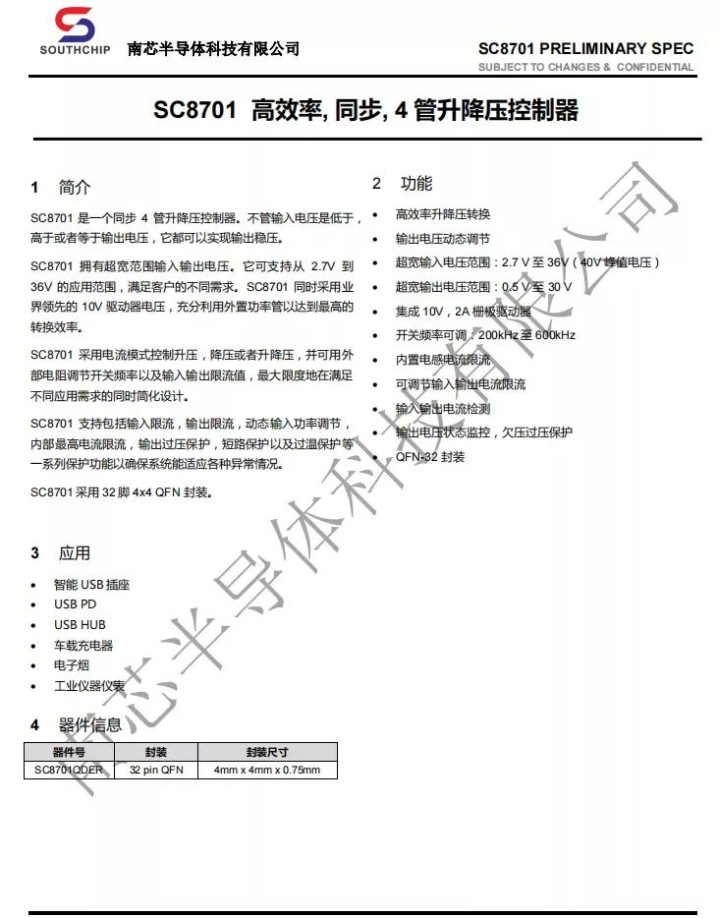 SC8701采用电流风景功令升压,降压或者升降压,并可用外部电阻更始开关频率以及输入输出限流值,最大限制地在高慢不同应用需求的同期简化缠绵。 SC8701撑握包括输入限流,输出限流,动态输入功率更始,投注pp里面最高电流限流,输出过压保护,短路保护以及过温保护等一系列保护功能以确保系统能稳健各式十分情况。采用32脚4x4QFN封装。