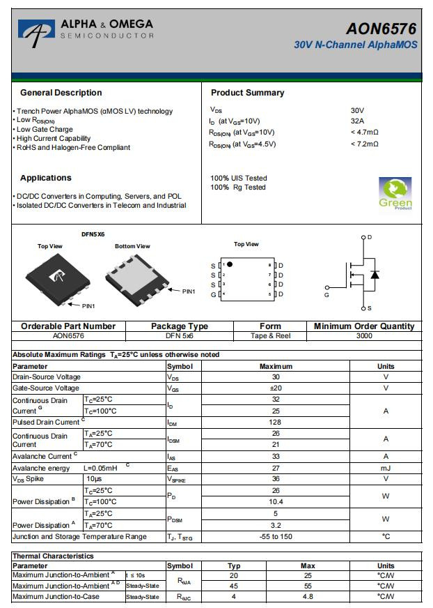 四颗同步升降压开关管来自AOS万国半导体,型号AON6576,NMOS,耐压30V,导阻4.7mΩ,采用DFN5*6封装。