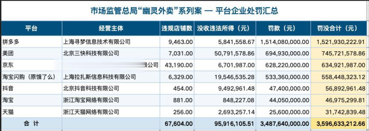 作家|陈小好意思 裁剪|文定 监管终于对“幽魂外卖”下狠手了,照旧一次性处罚7大平台。 4月17日,市集监管总局对拼多多、好意思团、京东、淘宝闪购(原饿了么)、抖音、淘宝、天猫7家平台“幽魂外卖”系列案作出行政处罚,所有罚没35.97亿元,并对7家平台企业法定代表东说念主和食物安全总监所有罚金1968.74万元。 这是自2015年更正食物安全法以来,面向平台开出的最大金额罚单。各平台具体罚金为:拼多多15.22亿元、好意思团7.46亿元、京东6.35亿元、淘宝闪购5.58亿元、抖音5689万元、淘宝4698万元、天猫3174万元。