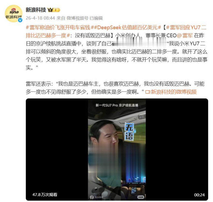 这话一出,有些东谈主就跟打了鸡血通常,启动多样解读。 咱公私分明,正常东谈主一听这话,齐知谈这是个打趣,等于个譬如,带点幽默感的那种。雷军的意旨真谛无非等于说YU7的二排空间诡计得相比认真,角度更清静那么一丢丢。 他莫得说YU7全地方吊打迈巴赫,更莫得谴责豪华品牌的意旨真谛。说白了,等于基于一个客不雅的小细节,用迁延的样貌讲了出来。 但等于这句打妙语,被水军番来覆去黑了好久。他们把“比迈巴赫多一度”这六个字,硬生生解读成了“小米公开谴责传统豪华品牌”。 说真话,这种贯通角度,确实挺让东谈主莫名的。你如若真较真,你去量一量,还真就多了那么一度。怎样就成拉踩了呢? 只可说,有些东谈主等于揣着显明装浑沌,挑升带节律。