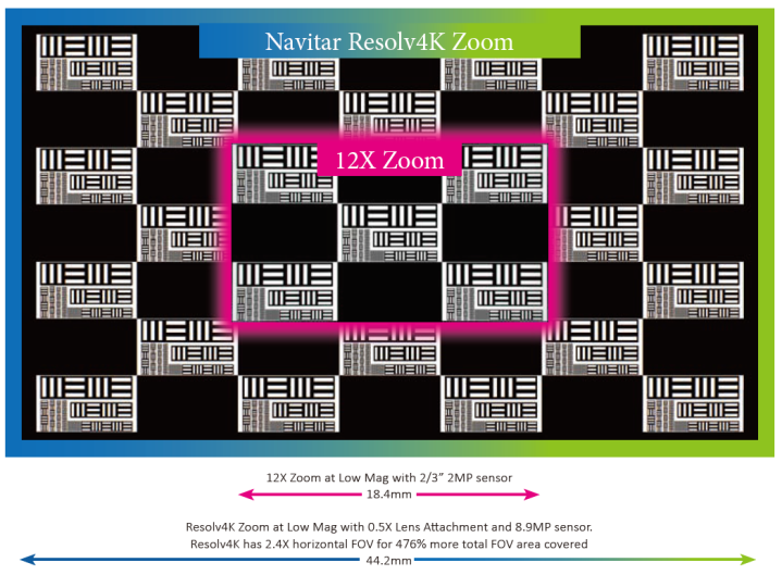 01.突破视场极限:扩大400%-600%,告别繁琐拼接 传统变焦成像系统在扩大视场时,经常伴跟着严重的细节丢失。而 RESOLV4K 展现出了惊东说念主的解析力。 比较传统系统,RESOLV4K的视场可大幅扩大400%-600%,且全程无细节亏空!这意味着在绝大巨额运用场景中,您无需再进行屡次拍摄和图像拼接,单次成像即可取得全局高清画面,检测效力呈指数级跃升。 硬核数据言语:当搭配 0.5 倍镜头附件与 890 万像素传感器使用时,RESOLV4K 低倍变焦镜头能爆发出惊东说念主的能量: • 水平视场晋升2.4倍 • 总视局面积隐蔽晋升高达476% • 视场宽度达到44.2mm