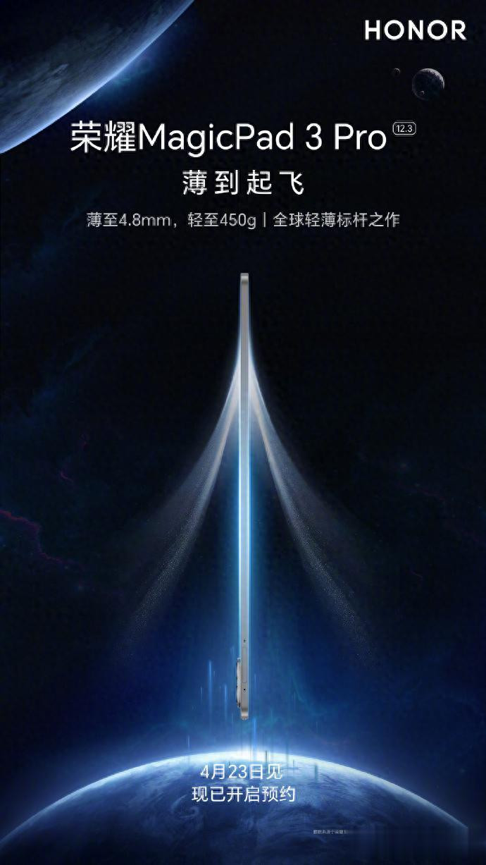 PChome 4月11号音问,荣耀官宣荣耀MagicPad3 Pro 12.3英寸版平板将在4月23日矜重发布,主打超浮薄体验,堪称众人浮薄标杆之作,现在仍是开启预约。