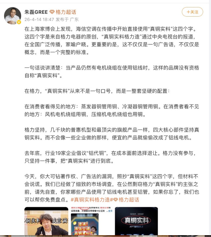 财联社4月15日讯(记者陆婷婷)这两日,格力电器(000651.SZ)与海信空调围绕“铜铝”的纷争激励市集情绪。 4月14日晚间,格力电器CMO朱磊发文质疑海信空调使用“真铜实料”表述,称该提法系来自格力原创,直言:当居品仍有电机绕组使用铝线时,这么的品牌莫得经验自称“真铜实料”。同期喊话海信自查旗下居品铝线电机、铝管哄骗情况。