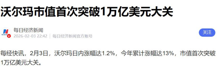 阅读应知:本文本体所有信息和数据,均为作家查阅官方信息和辘集已知数据整合解析,旨在让读者更明白了解相应信息,如至极据无理或不雅点有误,请精采指摘,作家积极改正!(创作不易,一篇著述需要作家查阅多方贵府,整合分析、追思,望大家领略) 许多东说念主觉得沃尔玛市值破万亿,阐明线下零卖又行了。沃尔玛的万亿市值更像一张“对照表”,把通胀环境、地舆结构、供应链智商、线上线下一体化这四件事,摆到所有零卖企业眼前逐条打分。 2026年2月3日,沃尔玛市值精致站上1万亿好意思元。一边是满屏的AI大模子、芯片、光模块,一边是卖纸巾、牛奶、生鲜的老超市,这种反差让东说念主误判,觉得“传统行业赢了”。