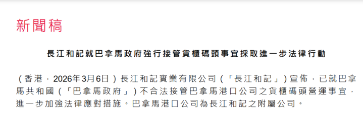 3月6日,李嘉诚旗下长江和记暗示:就巴拿马政府强行袭取货柜船埠事宜遴荐进一步法律行径。 长江和记晓示,已就巴拿马共和国不对法袭取巴拿马口岸公司之货柜船埠营运事宜,进一步加强法律应付门径。巴拿马口岸公司为长江和记之附属公司。 长江和记早前把柄一项适用并订明海外仲裁机制的投资保护协议,向巴拿马政府发出争议见知;长江和记现已就该争议见知提交补充文献,当中明确指出,巴拿马政府接续一意孤行,拒却疏通、中断谈论,更在欠缺透明度的情况下占用两个货柜船埠,并强行袭取巴拿马口岸公司之财产及职工。长江和记亦钟情到,巴拿马政府变本加厉,针对长江和记及巴拿马口岸公司发表多项子虚言论,令情况进一步恶化。 {jz:field.toptypename/}长江和记细察,巴拿马口岸公司已就第23号行政国法,真钱投注即号召占用巴拿马口岸公司设施及充公其财产之行政国法,建议行政呈请,条目赐与再行探究。同期,巴拿马口岸公司拒却接受巴拿马政府不对法充公巴拿马口岸公司特有及受法律保护之文献和材料。上述行径,乃巴拿马口岸公司继早前把柄海外商会仲裁限定,对巴拿马政府运行海外仲裁体式后,所遴荐之进一步行径。 长江和记不本心巴拿马政府最近所作之偏颇步履,并将接续与法律督察人评估格局,就此事宜诉诸一切可行之国内及海外法律体式。