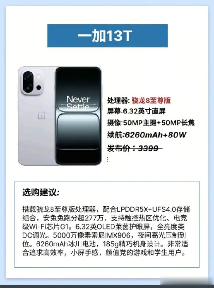 一加13T以小屏旗舰的定位脱颖而出,搭载骁龙8至尊版处理器,相助LPDDR5X与UFS4.0存储组合,安兔兔跑分跳跃277万。6.32英寸OLED莱茵护眼屏,赈济全亮度类DC调光,兼顾了浮现成果与护眼需求。5000万像素索尼IMX906主摄,在夜间高光压制方面发扬凸起。6260mAh冰川电板与80W快充的组合,相助185g的轻巧机身,特殊合乎追求小屏手感与高效力的用户。